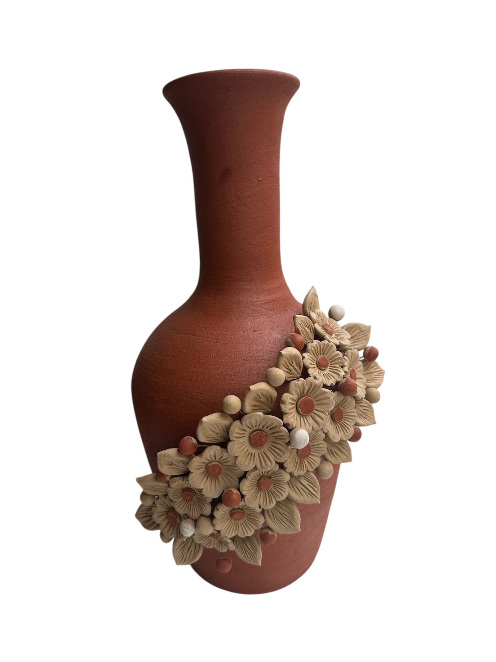 Es una pieza artesanal elaborada a partir de un tipo específico de arcilla que, al ser cocida, adquiere un color rojizo. Este barro se utiliza comúnmente en la fabricación de cerámica decorativa y utilitaria, especialmente en México. El término «pastillaje» hace referencia a un estilo de modelado y decoración que busca lograr un acabado texturizado y detallado, a menudo con relieve.