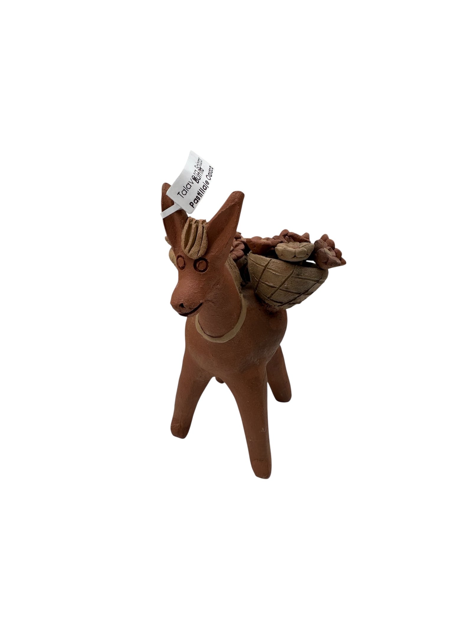 Es una pieza artesanal elaborada a partir de un tipo específico de arcilla que, al ser cocida, adquiere un color rojizo. Este barro se utiliza comúnmente en la fabricación de cerámica decorativa y utilitaria, especialmente en México. El término «pastillaje» hace referencia a un estilo de modelado y decoración que busca lograr un acabado texturizado y detallado, a menudo con relieve.