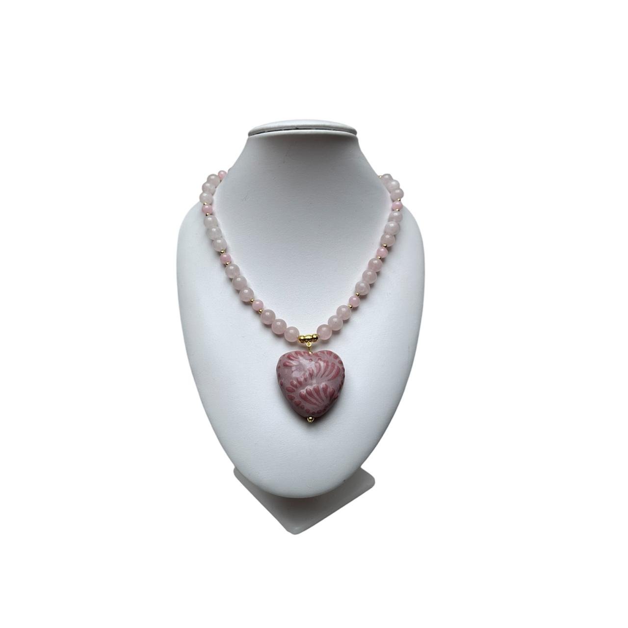 Collar Cuarzo Rosa Con Corazon Fondo Rosa con Rosa Cenefa