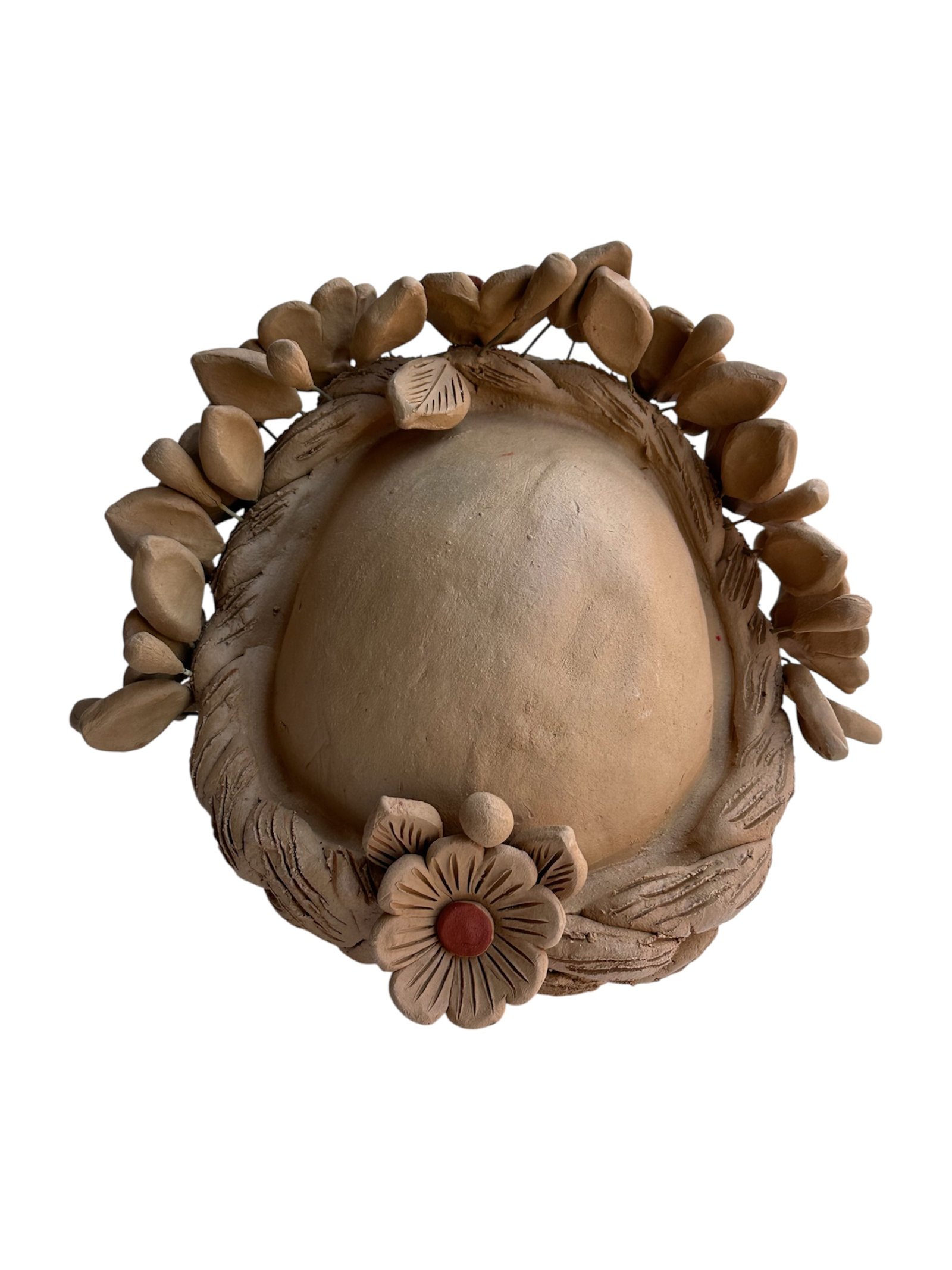 Es una pieza artesanal elaborada a partir de un tipo específico de arcilla que, al ser cocida, adquiere un color rojizo. Este barro se utiliza comúnmente en la fabricación de cerámica decorativa y utilitaria, especialmente en México. El término «pastillaje» hace referencia a un estilo de modelado y decoración que busca lograr un acabado texturizado y detallado, a menudo con relieve.