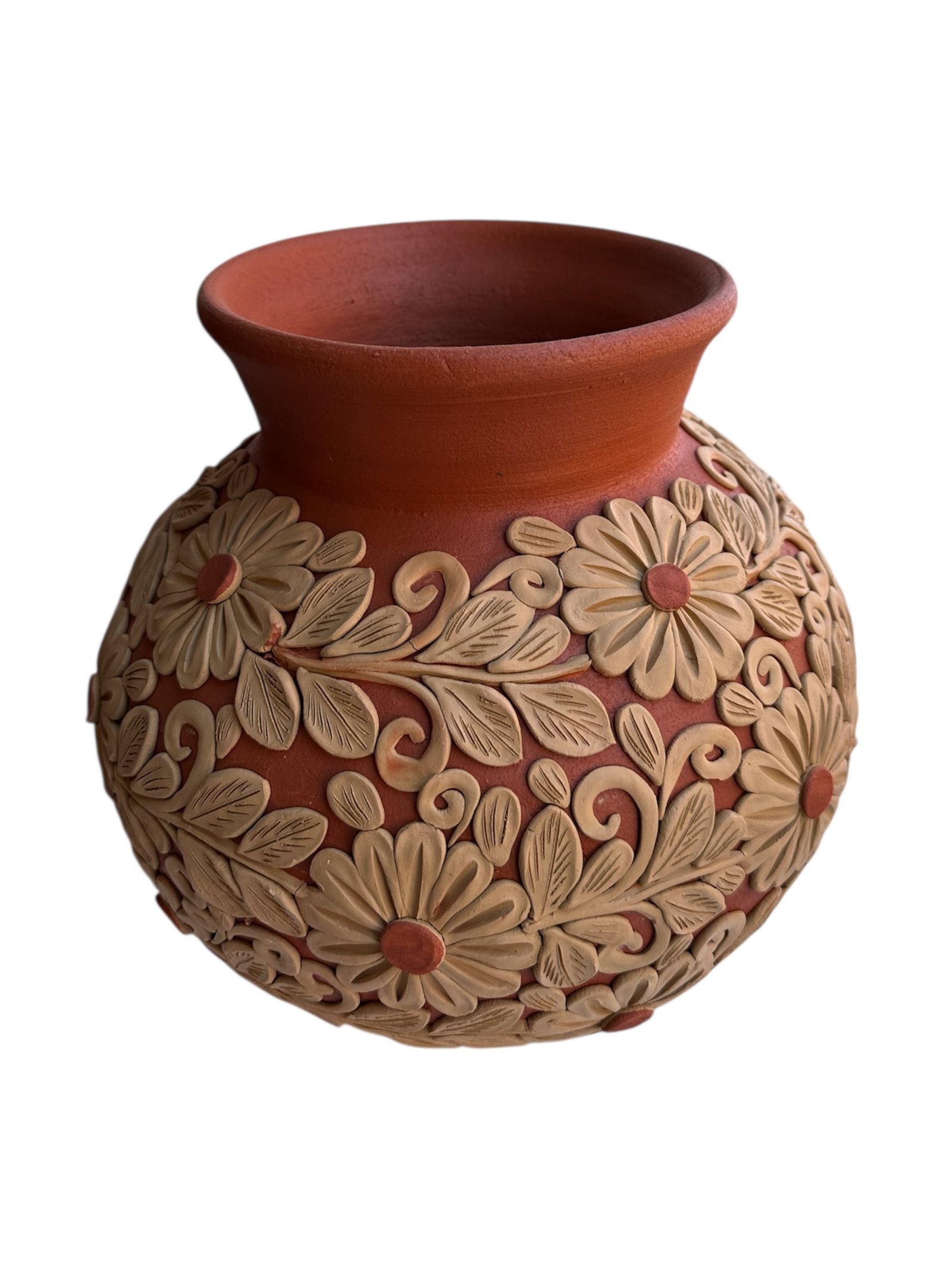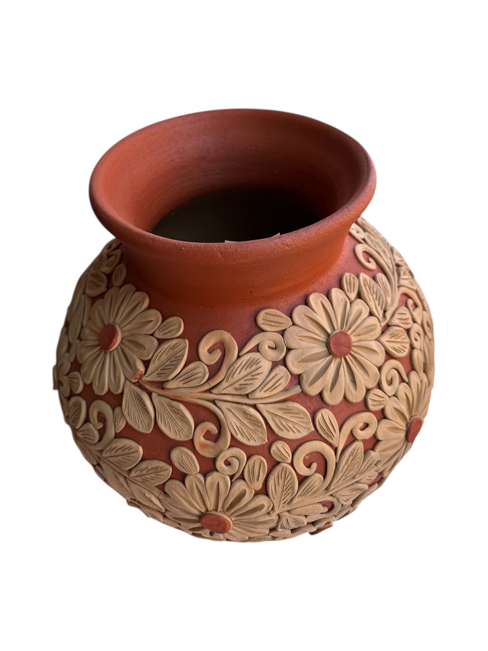 Es una pieza artesanal elaborada a partir de un tipo específico de arcilla que, al ser cocida, adquiere un color rojizo. Este barro se utiliza comúnmente en la fabricación de cerámica decorativa y utilitaria, especialmente en México. El término «pastillaje» hace referencia a un estilo de modelado y decoración que busca lograr un acabado texturizado y detallado, a menudo con relieve.