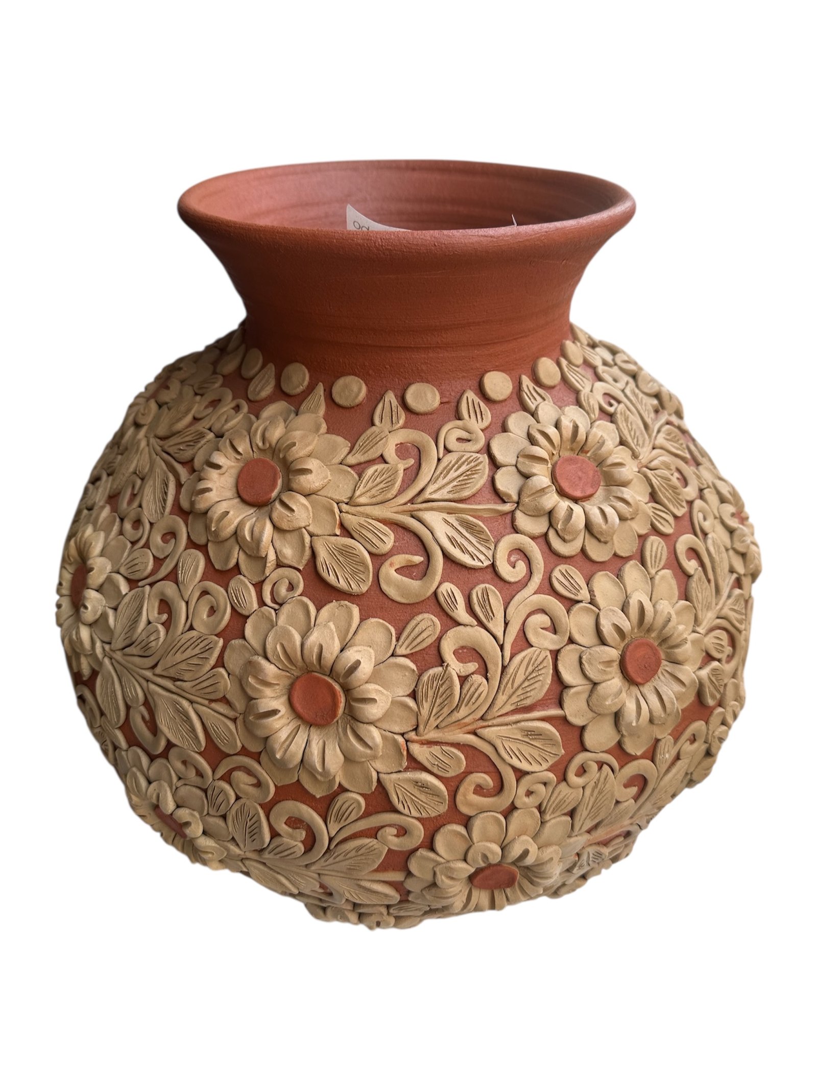 Es una pieza artesanal elaborada a partir de un tipo específico de arcilla que, al ser cocida, adquiere un color rojizo. Este barro se utiliza comúnmente en la fabricación de cerámica decorativa y utilitaria, especialmente en México. El término «pastillaje» hace referencia a un estilo de modelado y decoración que busca lograr un acabado texturizado y detallado, a menudo con relieve.